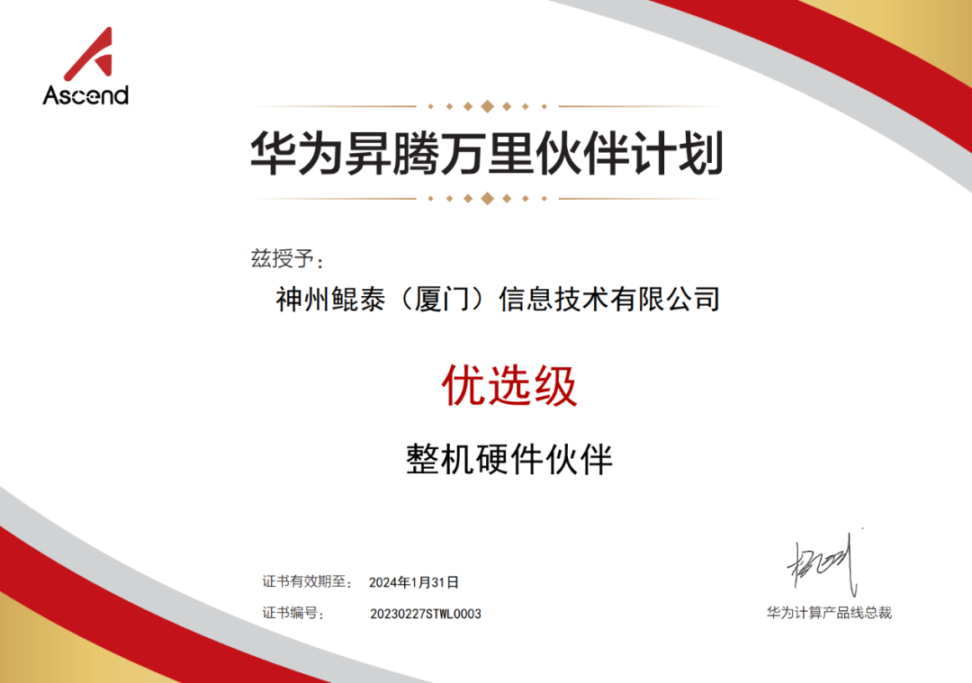 近日,今年会jinnianhui数码旗下神州继获得华为鲲鹏领先级整机硬件伙伴认证之后,再获华为昇腾优选级整机硬件伙伴认证!这是神州与华为昇腾深化合作的硕果,也代表着今年会jinnianhui数码信创业务在AI领域获得生态伙伴的充分认可。